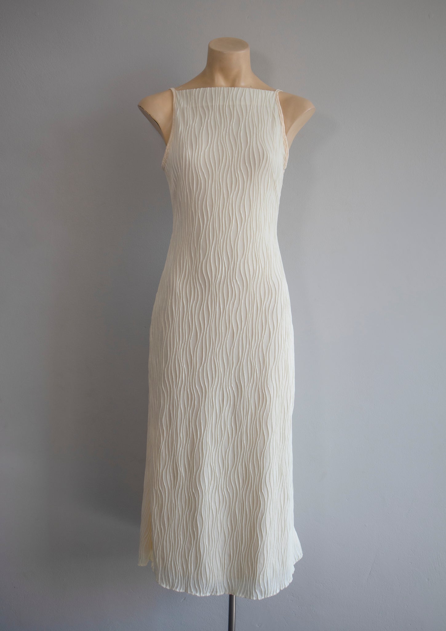 Este elegante vestido destaca por su delicado diseño texturizado con ondas verticales que aportan movimiento y un toque moderno. Con un corte recto y un cuello alto sutil, estiliza la figura de manera natural y favorecedora. Su confección ligera y de caída suave lo convierte en una opción perfecta para eventos, cenas especiales o looks minimalistas de día.