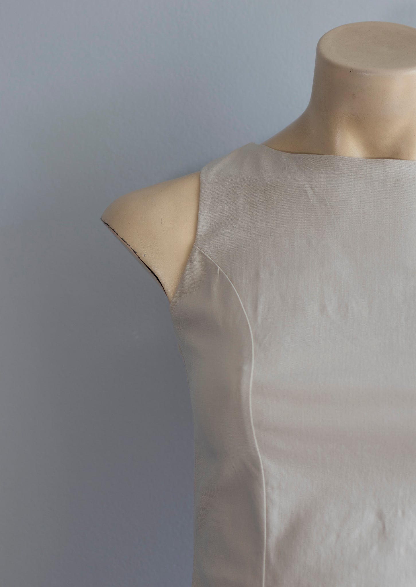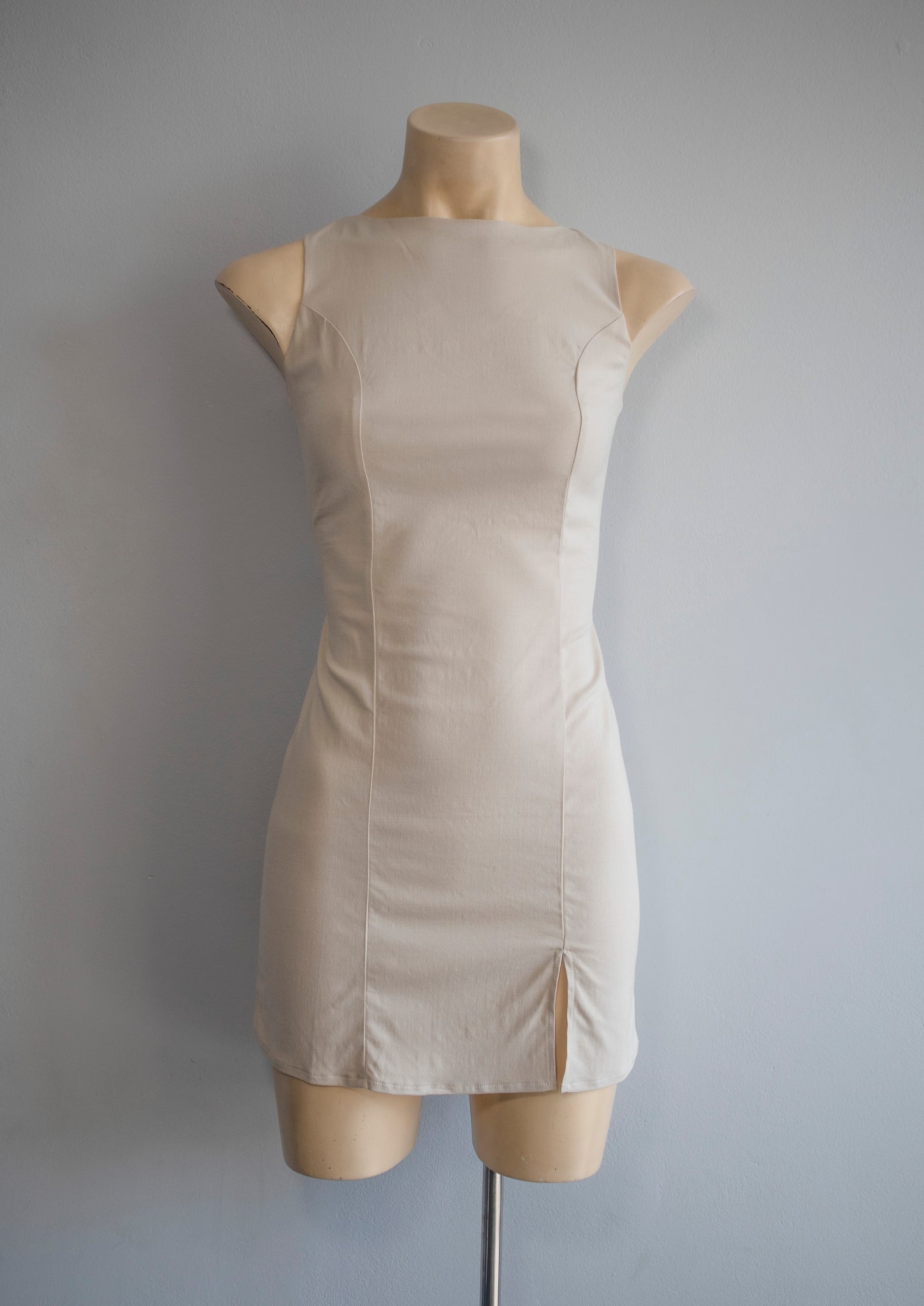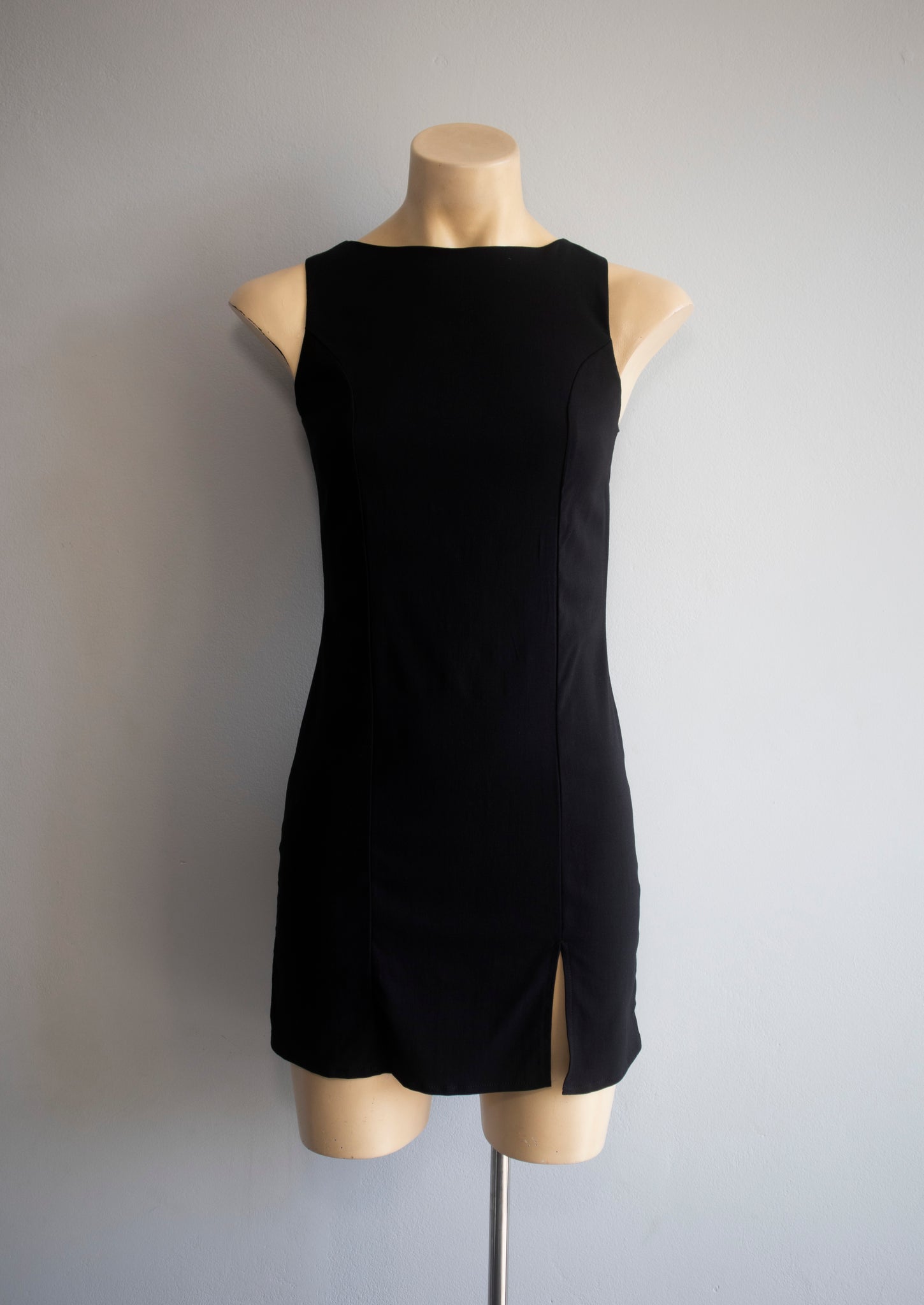 Vestido manga cero de cuello alto con detalle de pequeña abertura en pierna. El nuevo básico en tu closet que necesitarás.