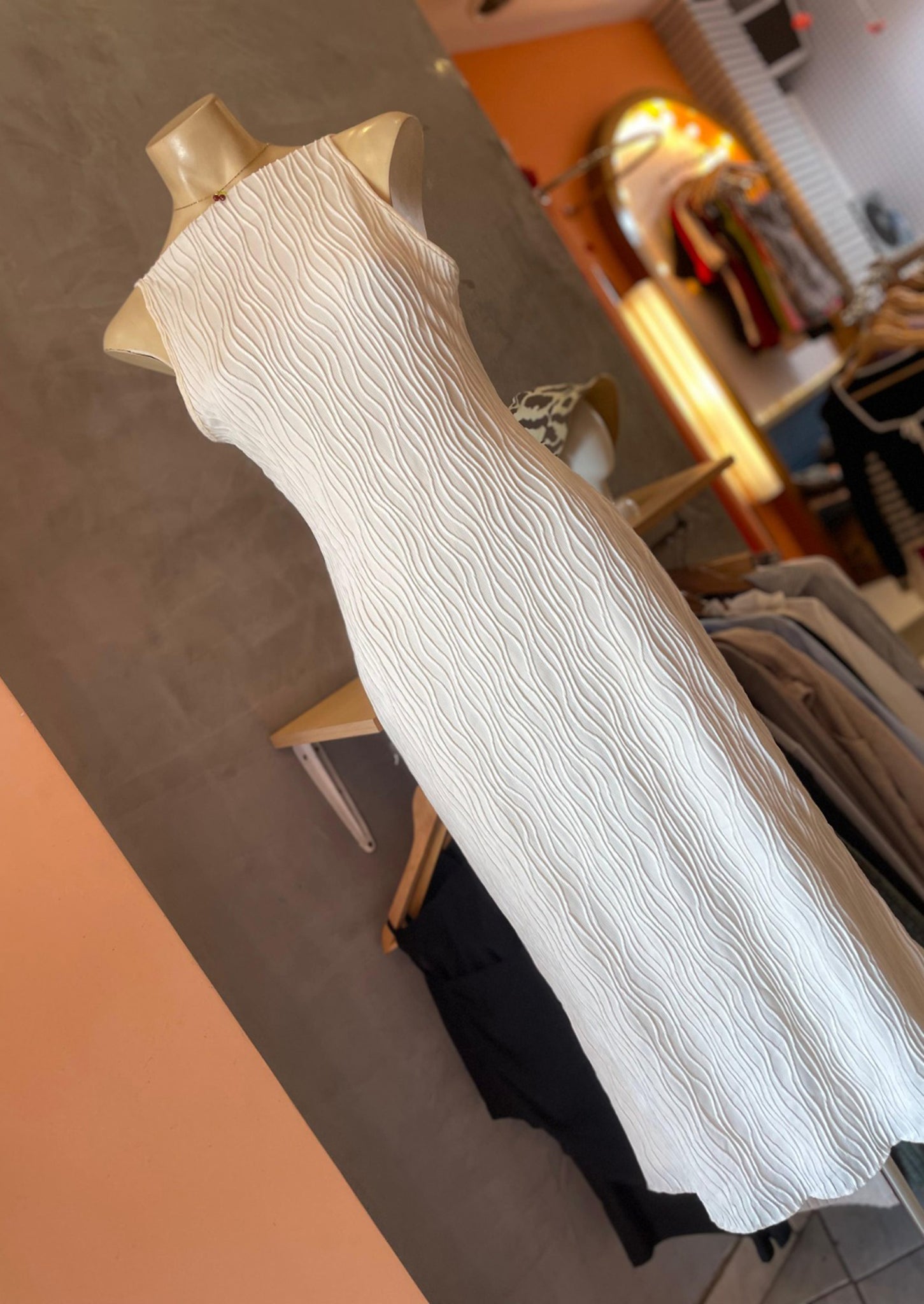 Vestido con cuello alto estilo halter, con tiritas la tela tiene detalles.